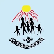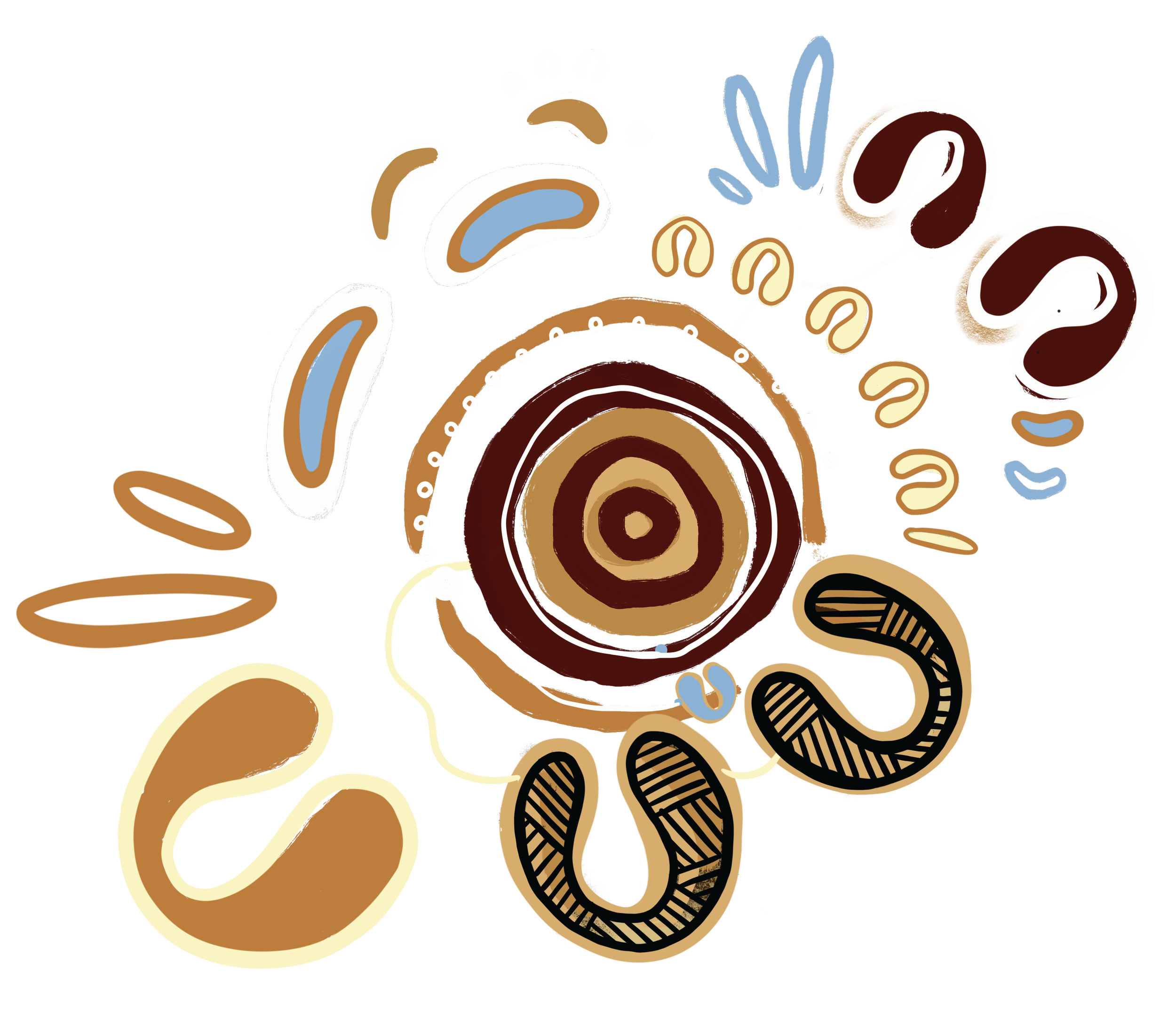 Flowing water, essential for both health and wellbeing runs through and around the meeting place. A larger central figure stands proudly nearby, representing leadership and the strategic and community direction that guides Yoorana Gunya forward.