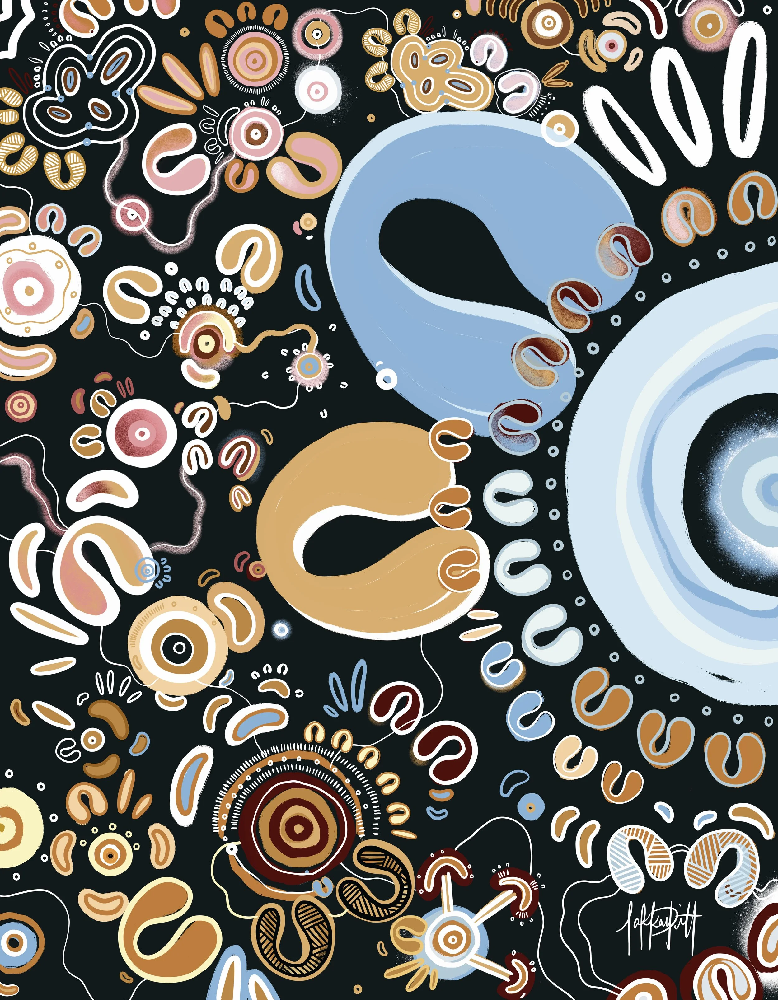 The work is surrounded with symbols of Country. Rocks, sand, patterns, artefacts and figures travelling between places.